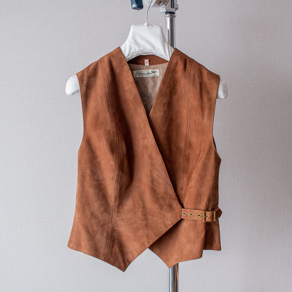 女性合わせですが男性が着ても様になるデザインで、上品に着られるジャーキンのようなイメージです。腰の片側ベルトが特徴的で、開いて着ても面白いです。