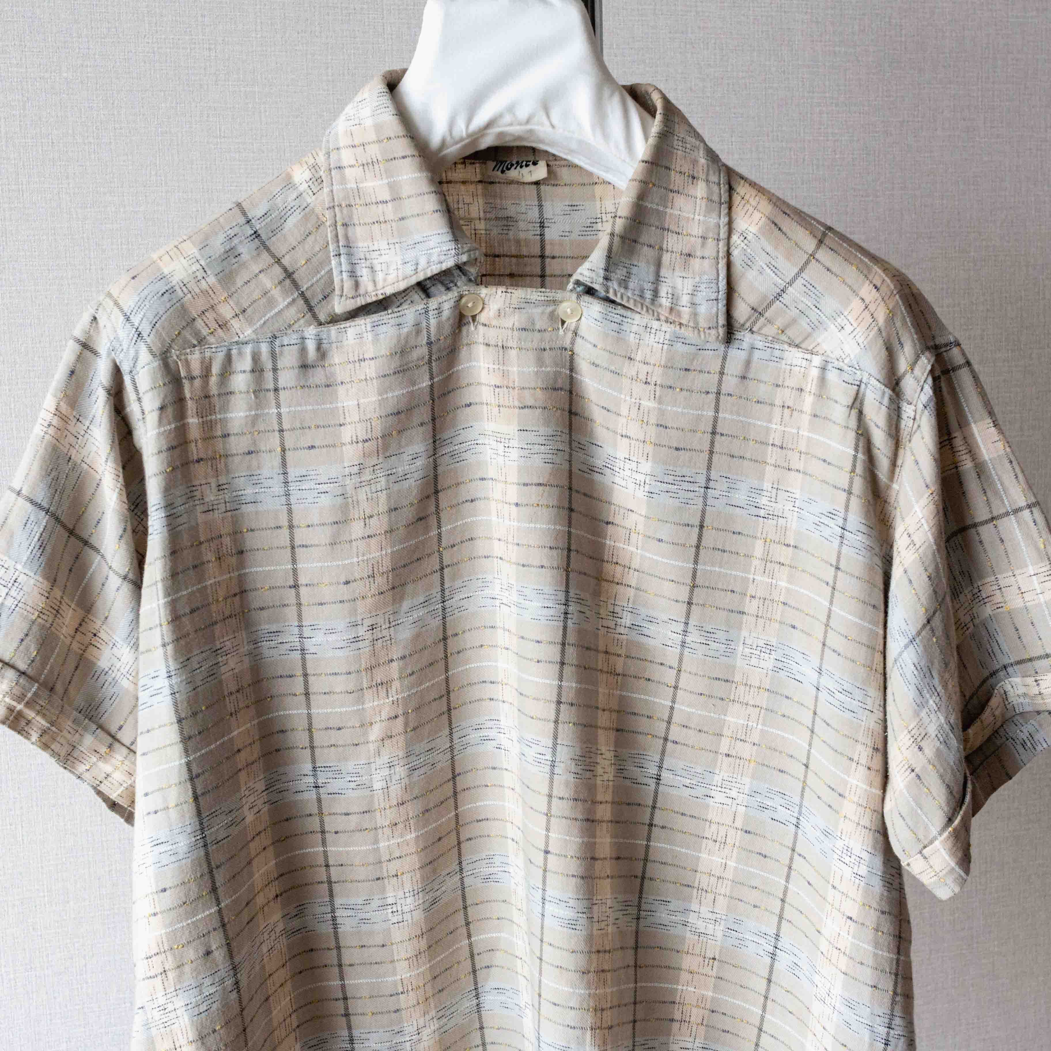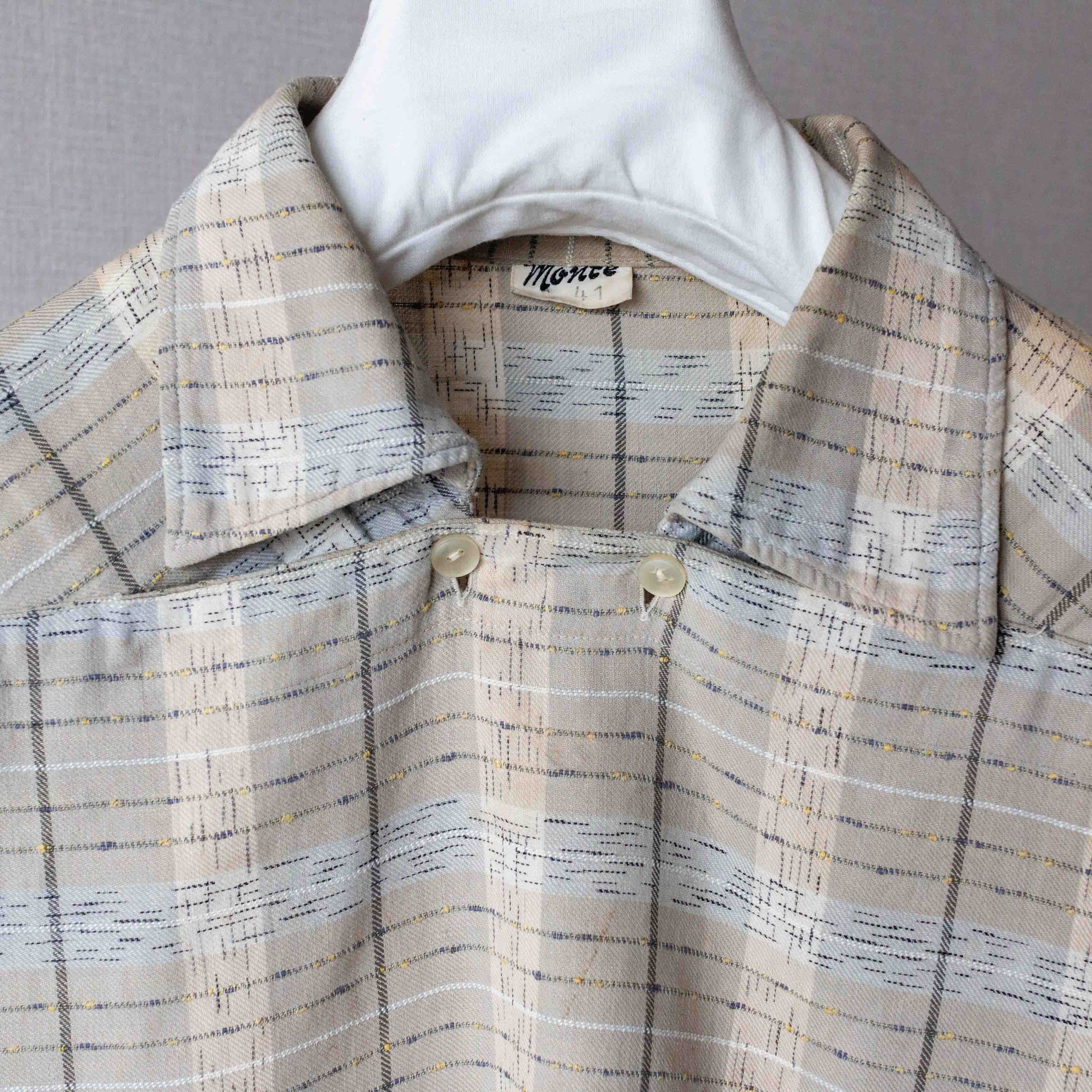 被るように着て、胸元の水平に付いたボタンを留めて着用します。通称ピーターパンシャツとも呼ばれるデザインのシャツです。落ち着いた色合いのチェック柄で、良い雰囲気です。後ろ見頃に直し跡があります。