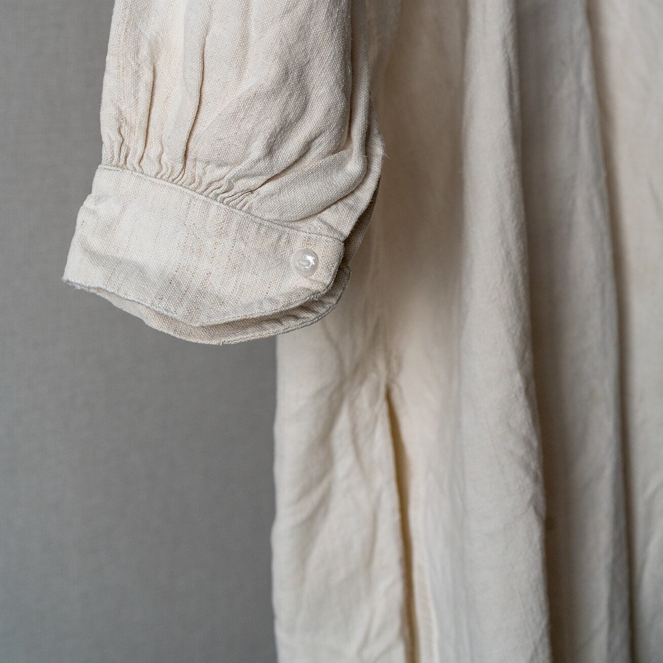当時フランスの農夫が使用していたとされる服で、全て手作業で作られています。襟周りは細かいギャザーが入っていて非常に手の込んだ作り。肩の部分で補強が施されていることと、袖口がラウンドしているところが特徴的です。