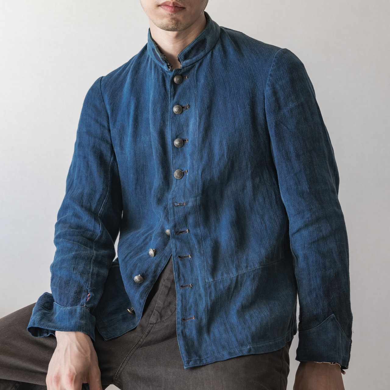 フレンチビンテージの代表的アイテムの一つであるファイアーマンジャケットです。ヘリンボーンのインディゴリネン生地で雰囲気は抜群。襟章や袖口の装飾は取られていますが、外された部分が濃い紺色になっています。袖口に赤のパイピングの一部が残っています。赤の装飾はファイアーマンジャケットらしいでティールではありつつ、雰囲気が出過ぎるため普段使いがし辛くなる面があります。本個体は派手な装飾が削ぎ落とされ、かつ装飾の跡が程よくアクセントになっているのでコーディネートに落とし込みやすいです。