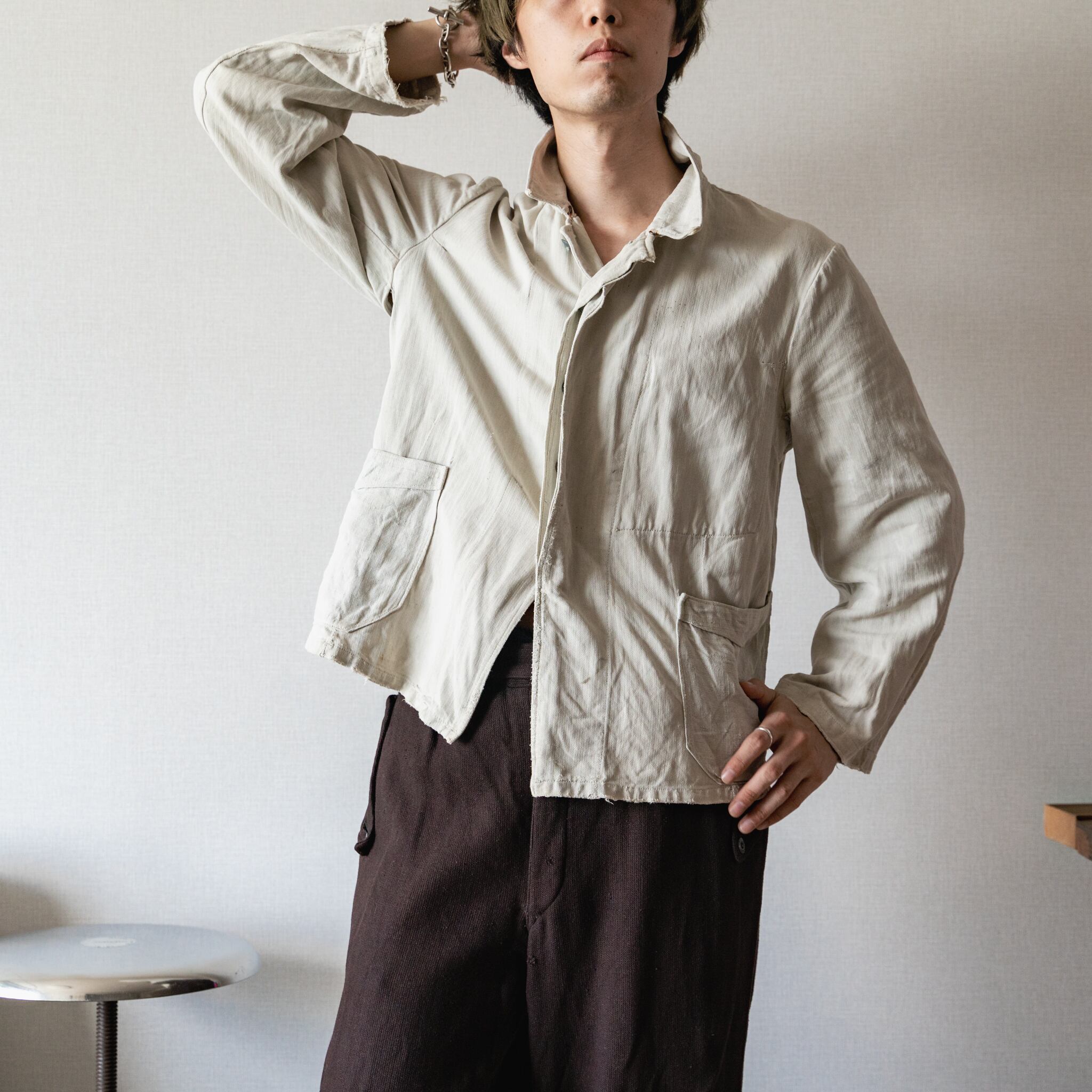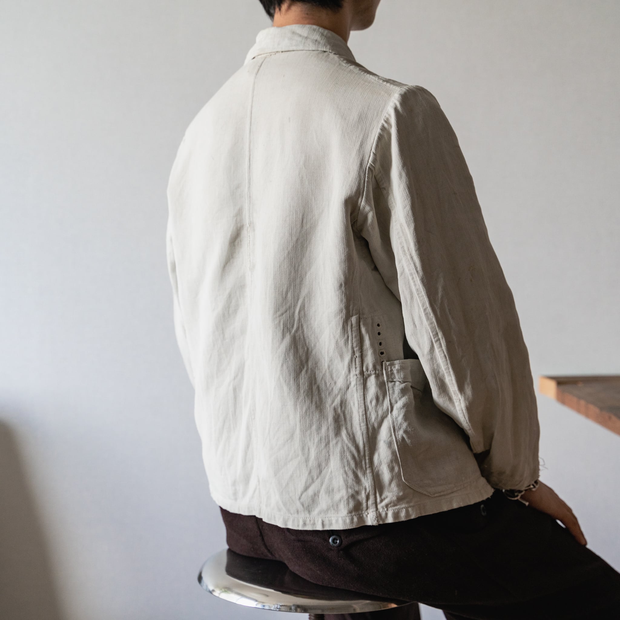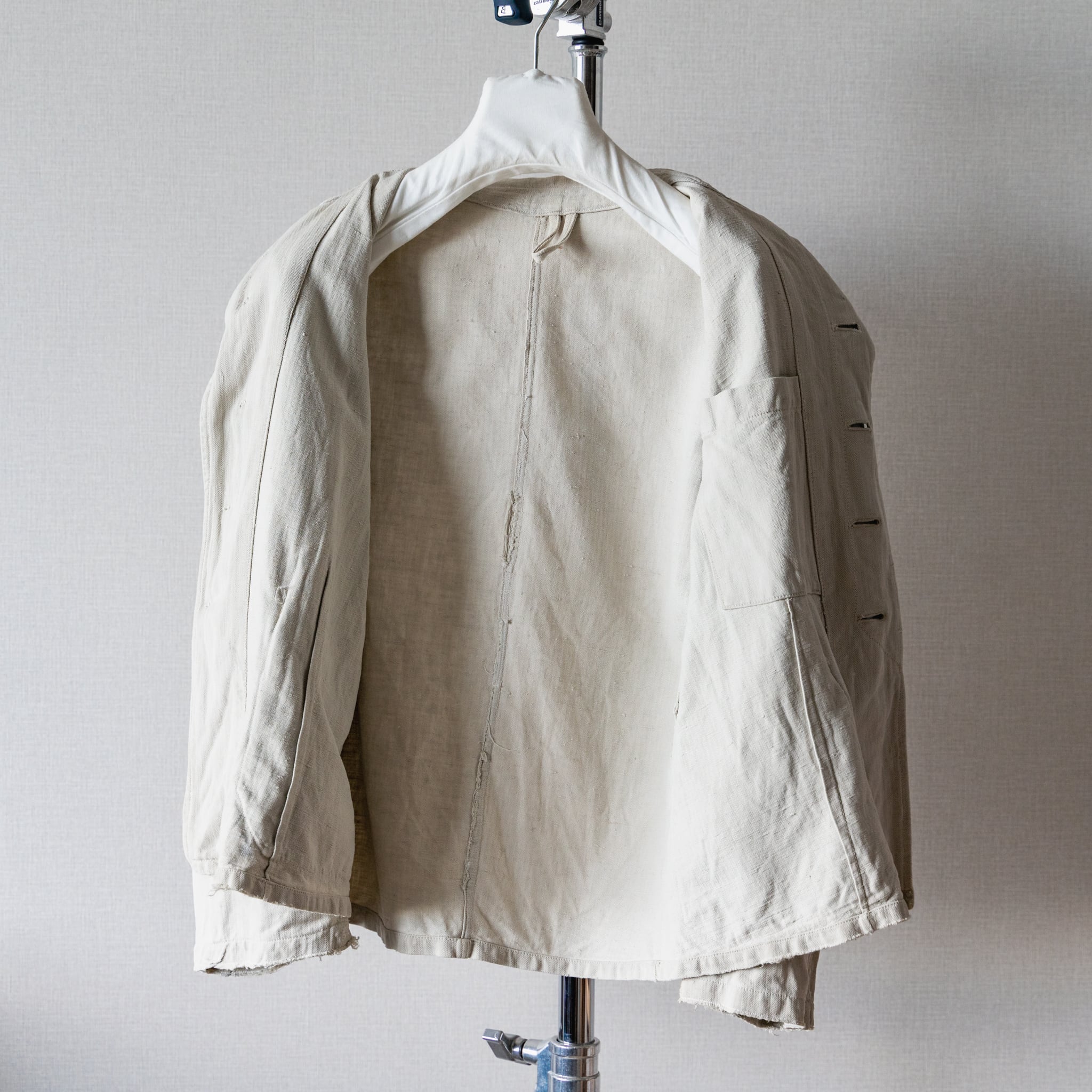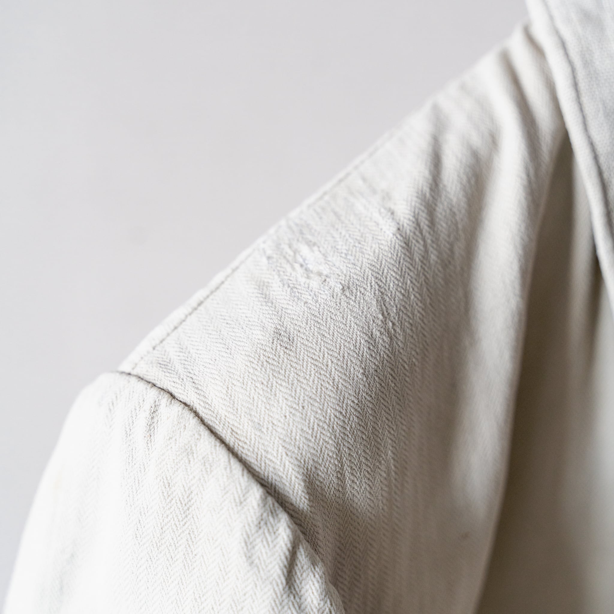 ドイツ空軍 "Luftwaffe" で使用されていたと思われるジャケットです。ヘリンボーンに織り込まれた生地(おそらくコットンリネン)は動かすとブルブルと独特な質感があります。比翼ボタンとコンパクトな襟で、非常にシンプルなデザインです。