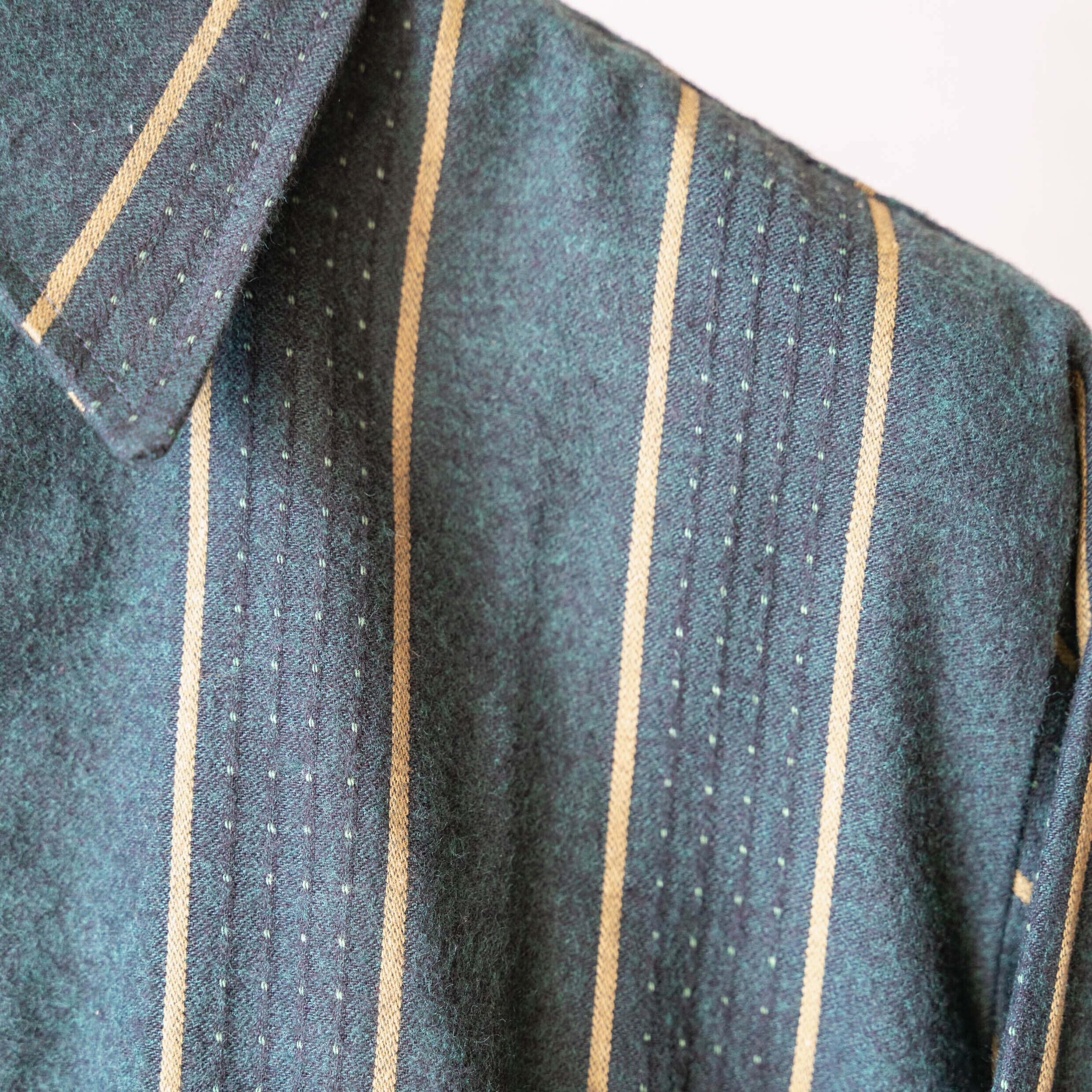 60年代フランス製フランネルシャツ。フラッシャータグ付きの未使用品です。深い緑のフランネル生地にマスタード色のストライプと同系色の糸を使った編み込み柄。秋に使いやすい落ち着いた配色です。